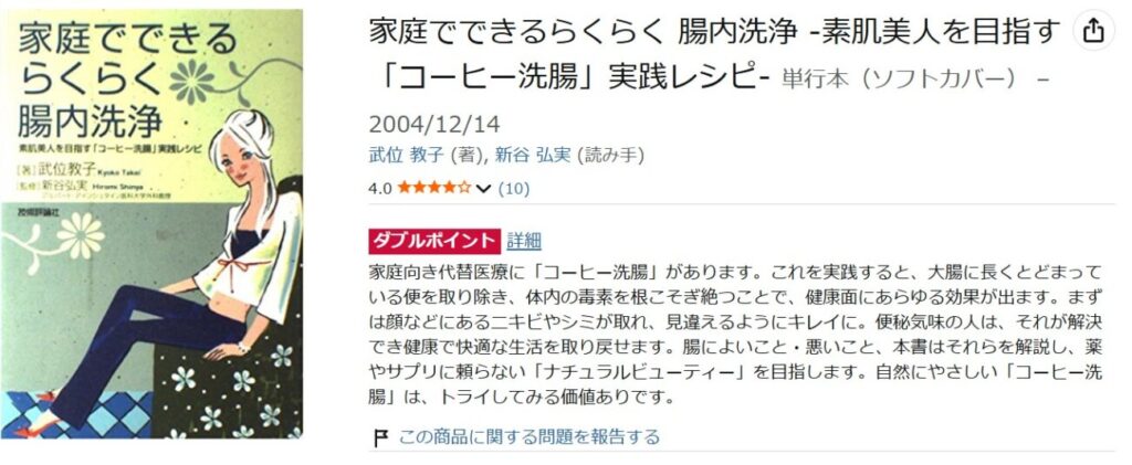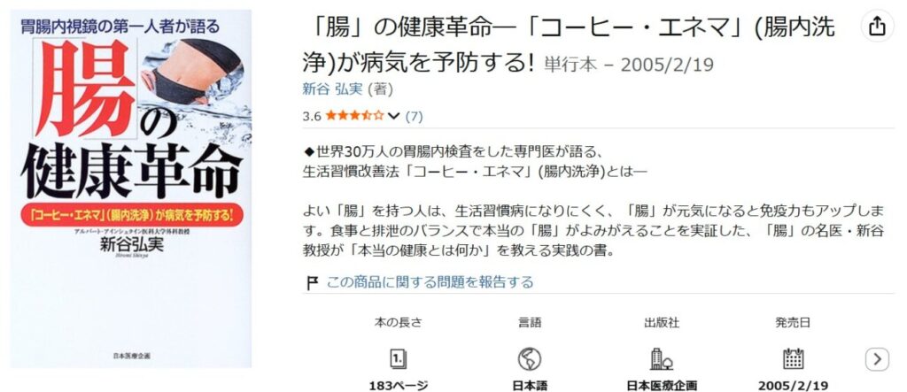同じような話はこれまでも二度ほどご紹介してきたような気もしますが、つい先日に「お試しを買ったけど勇気が出なくて」という方がいらっしゃったので改めて書かせて頂きました。 やはり「人から聞いた話」だけを頼りに理解しようとするよりは、自ら調べて疑問や不安の真意を確かめて頂く方が、結果としてより納得感のある判断に繋がると思いますしね。 新谷氏関連の書籍なら医学的な見地からの話も踏まえて書かれていますから、参考にしていただくには良いと思います。 コーヒーエネマ